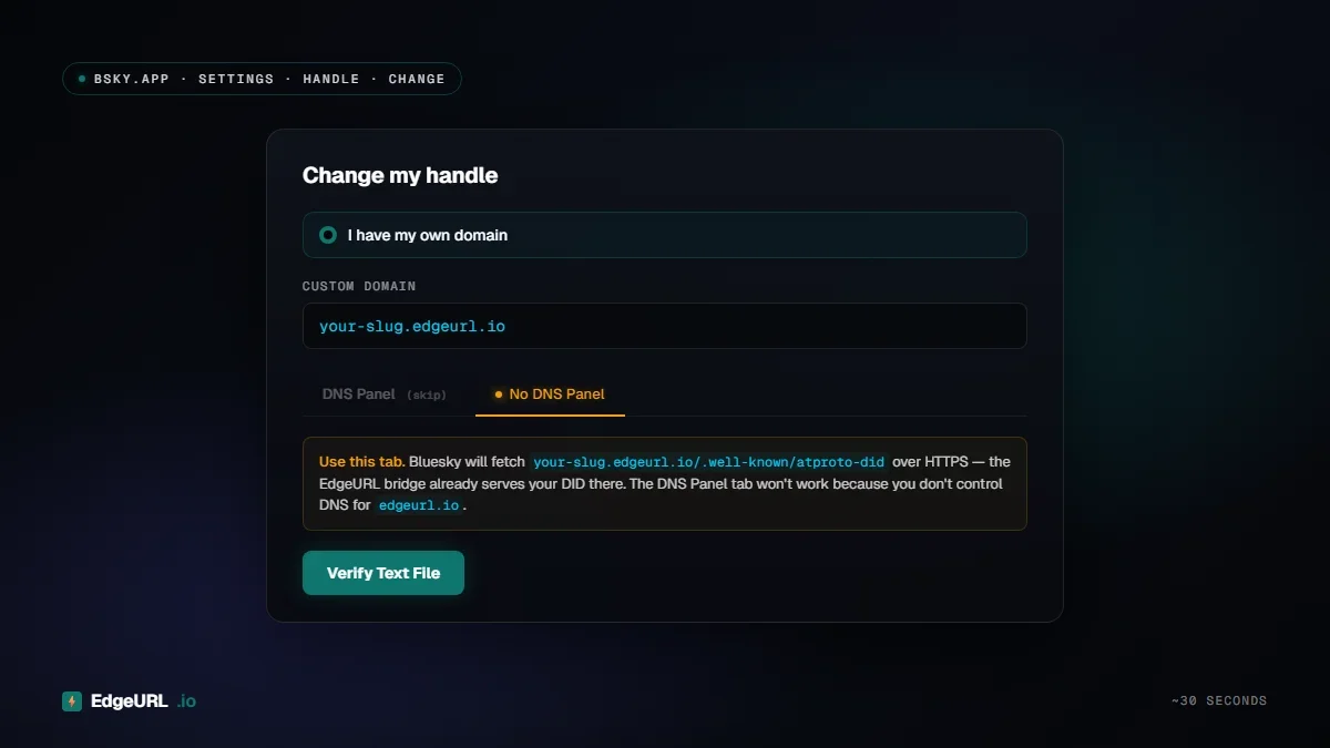 Bluesky defaults to the DNS Panel tab and asks you to add a TXT record. That flow won't work because you don't control DNS for edgeurl.io. The No DNS Panel tab uses an HTTPS file lookup instead, which EdgeURL is hosting for you.