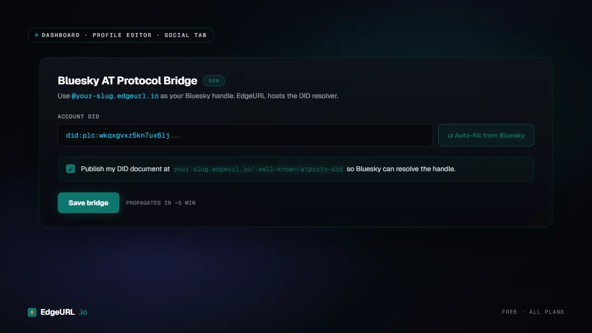 Set your Bluesky handle to your-slug.edgeurl.io for free. EdgeURL publishes your DID document at the address Bluesky checks. No DNS to configure, no monthly fee, no separate app to install. You keep full custody of your DID — we just host the resolution endpoint.
